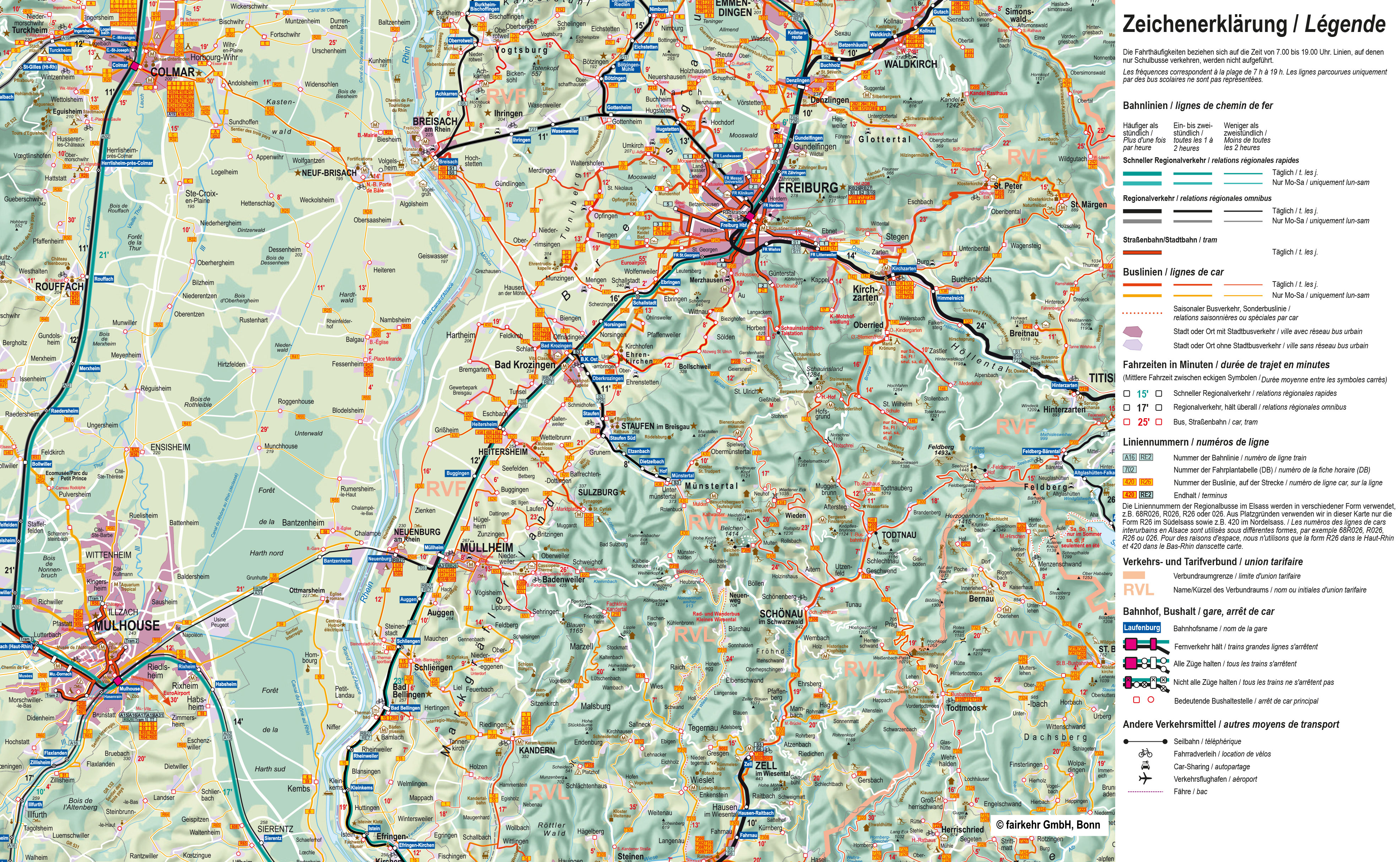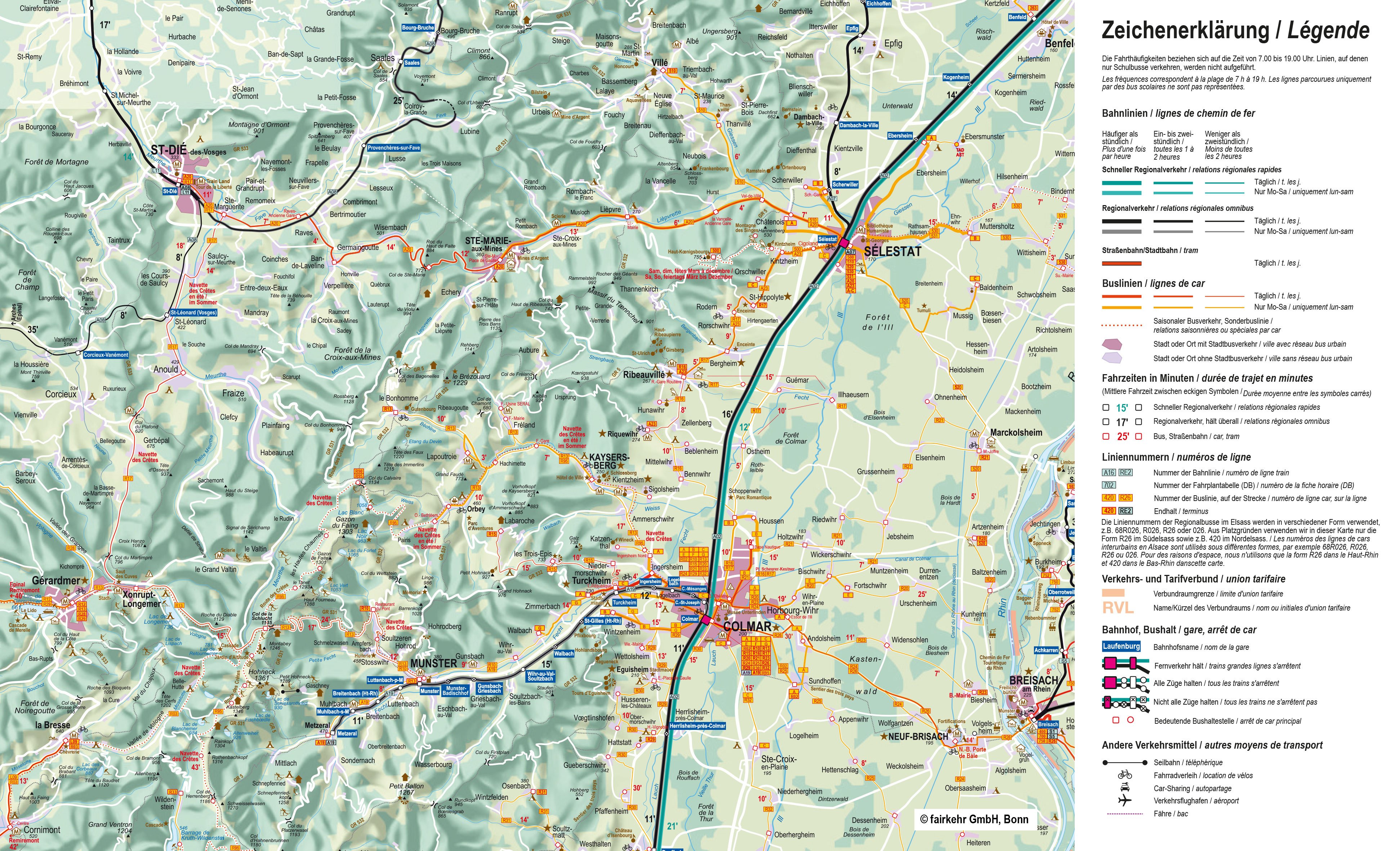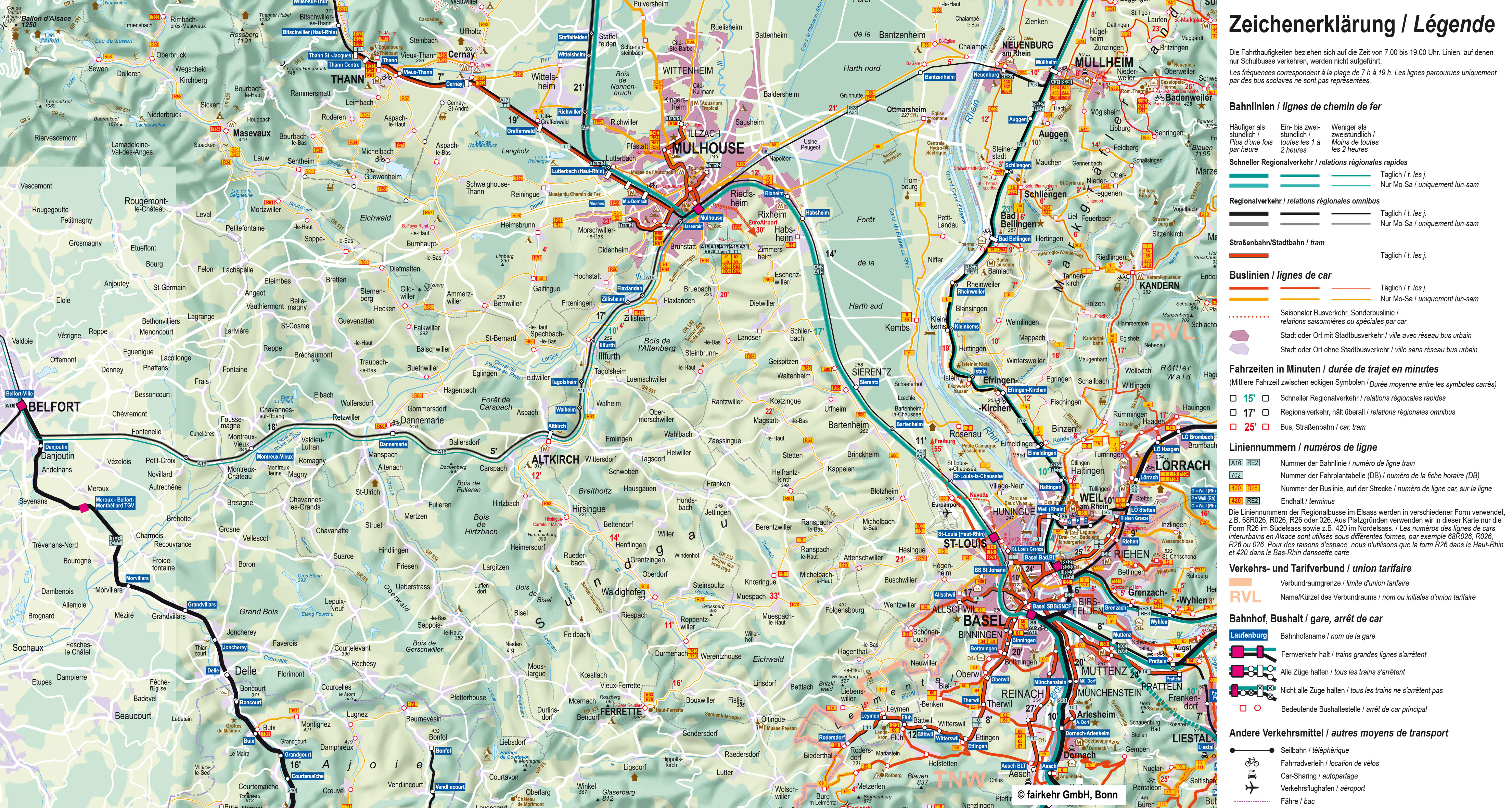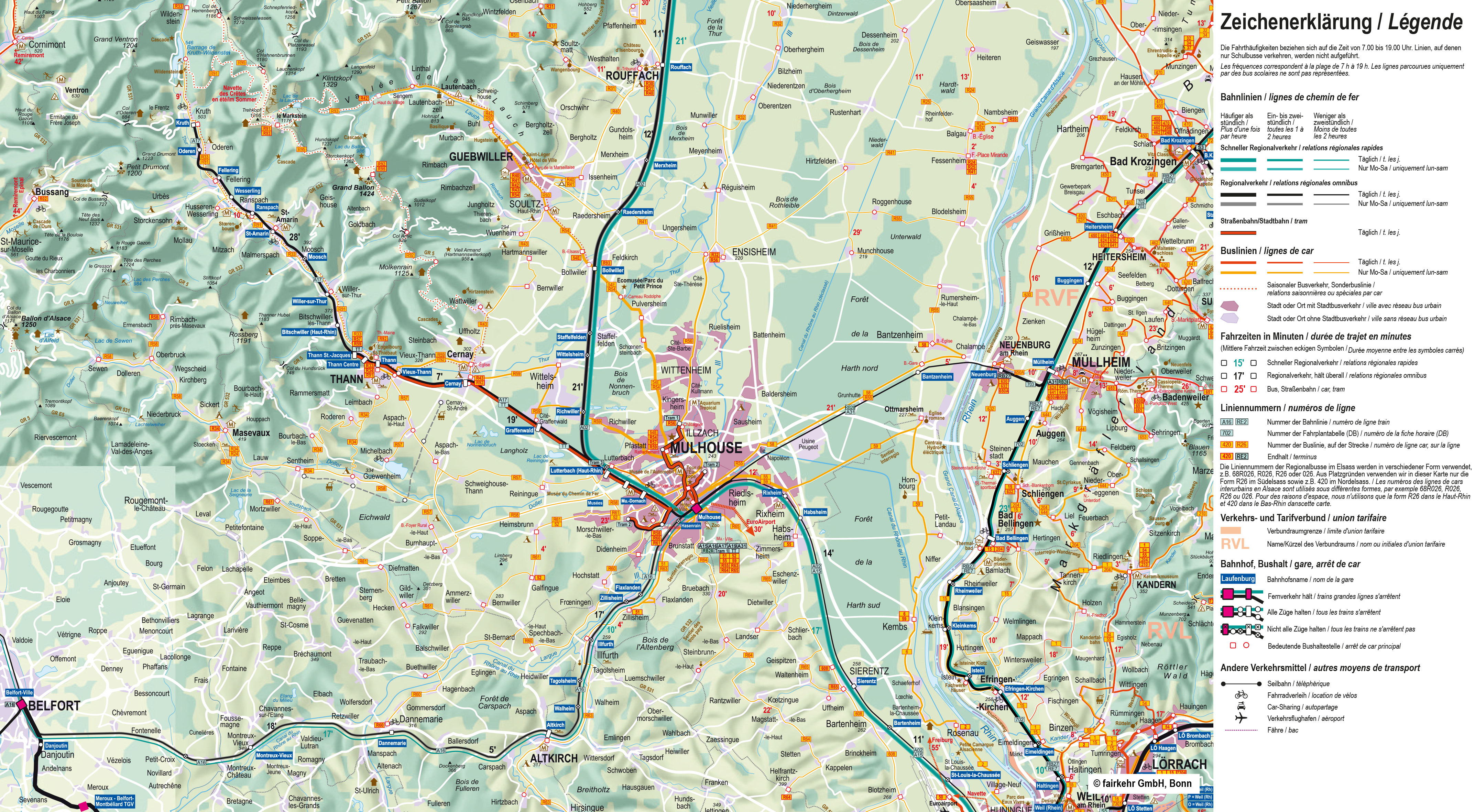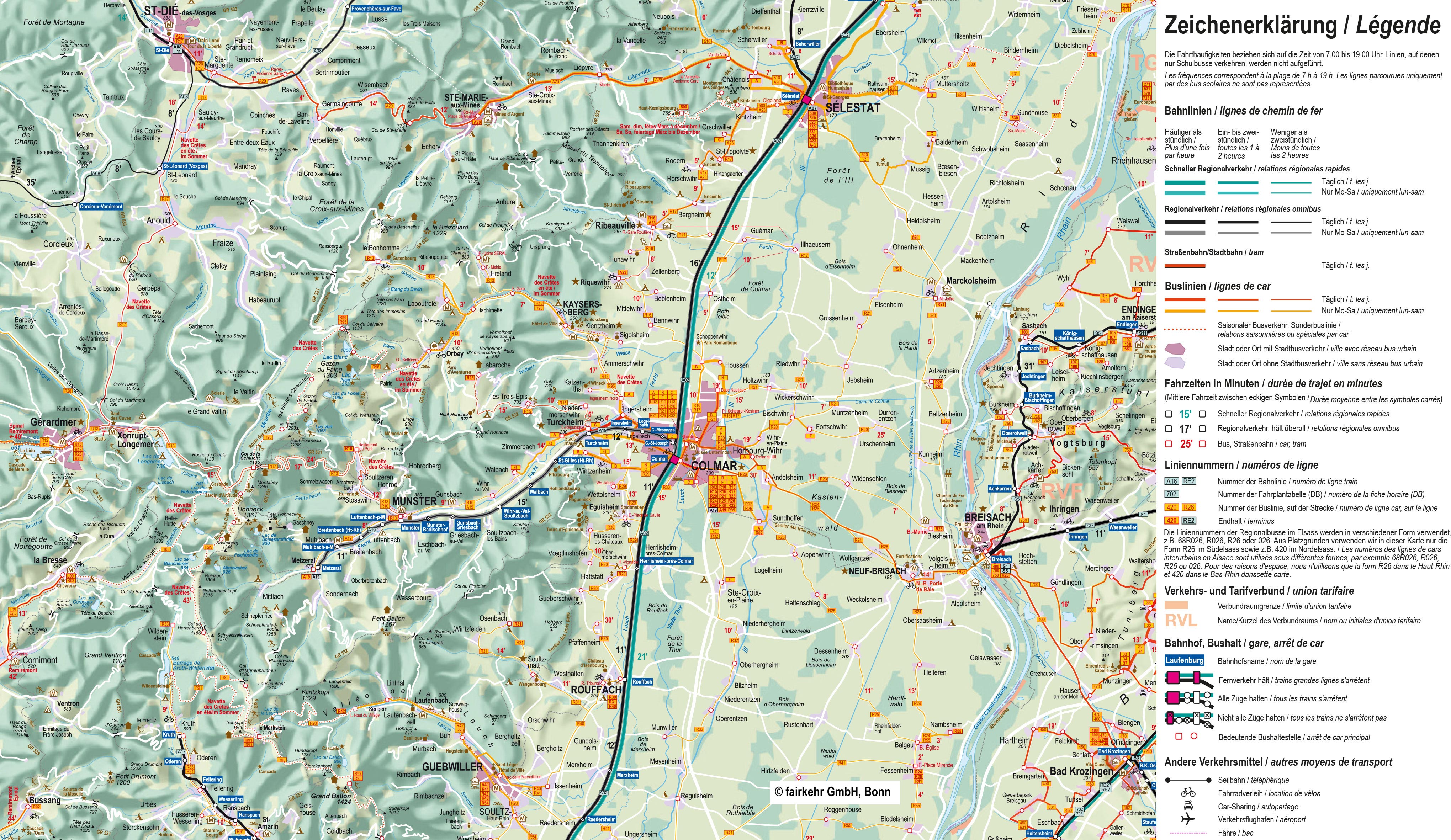 Veuillez noter que, pour des raisons d'espace, nous indiquons dans nos cartes les numéros de ligne sous la forme R26, etc. pour les bus du Haut-Rhin. Sur les bus eux-mêmes, la forme R026 est généralement utilisée, tandis que les horaires affichés aux arrêts indiquent la désignation complète 68R026 ou simplement 026. Il s'agit dans tous les cas de la même ligne.