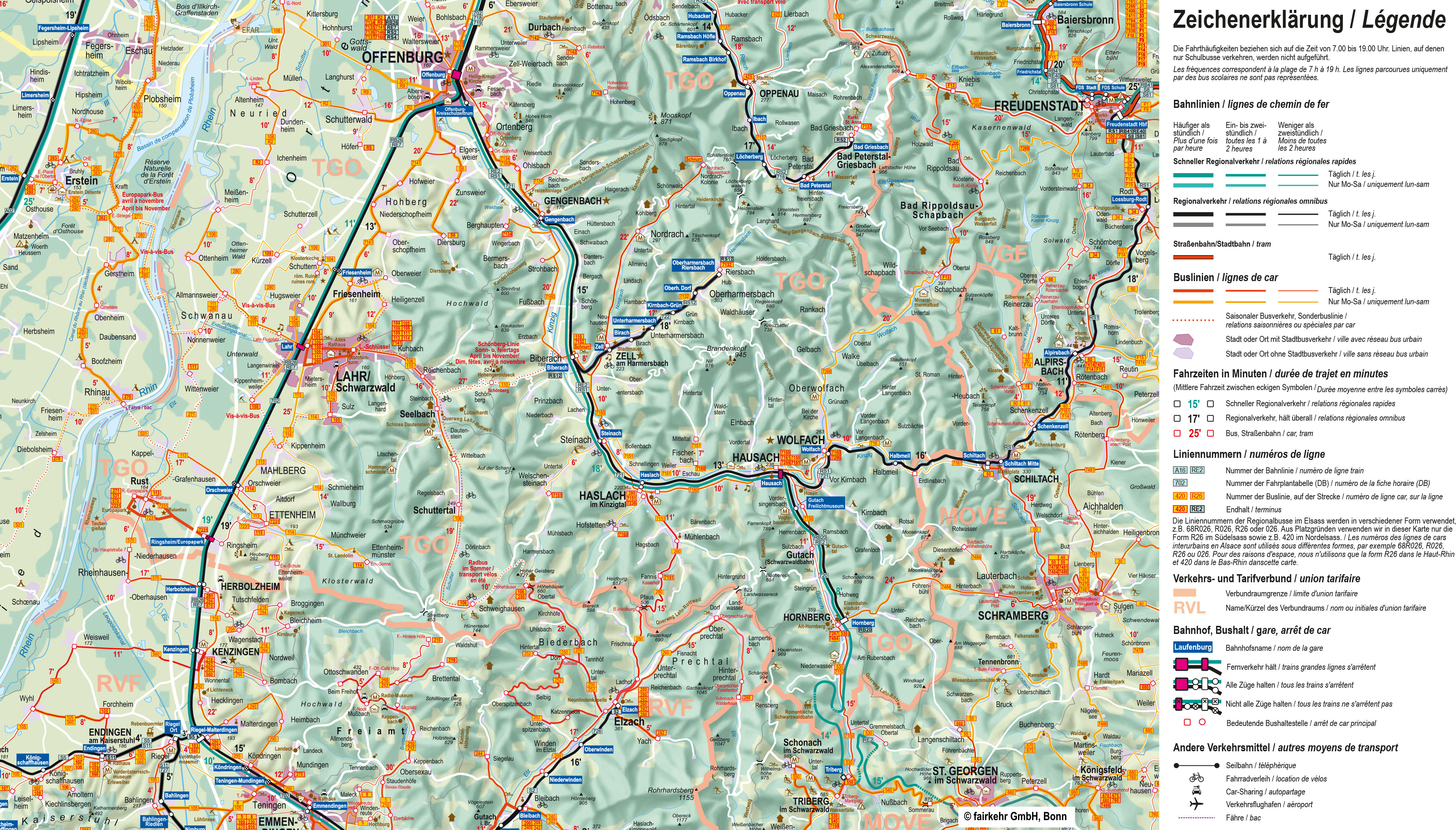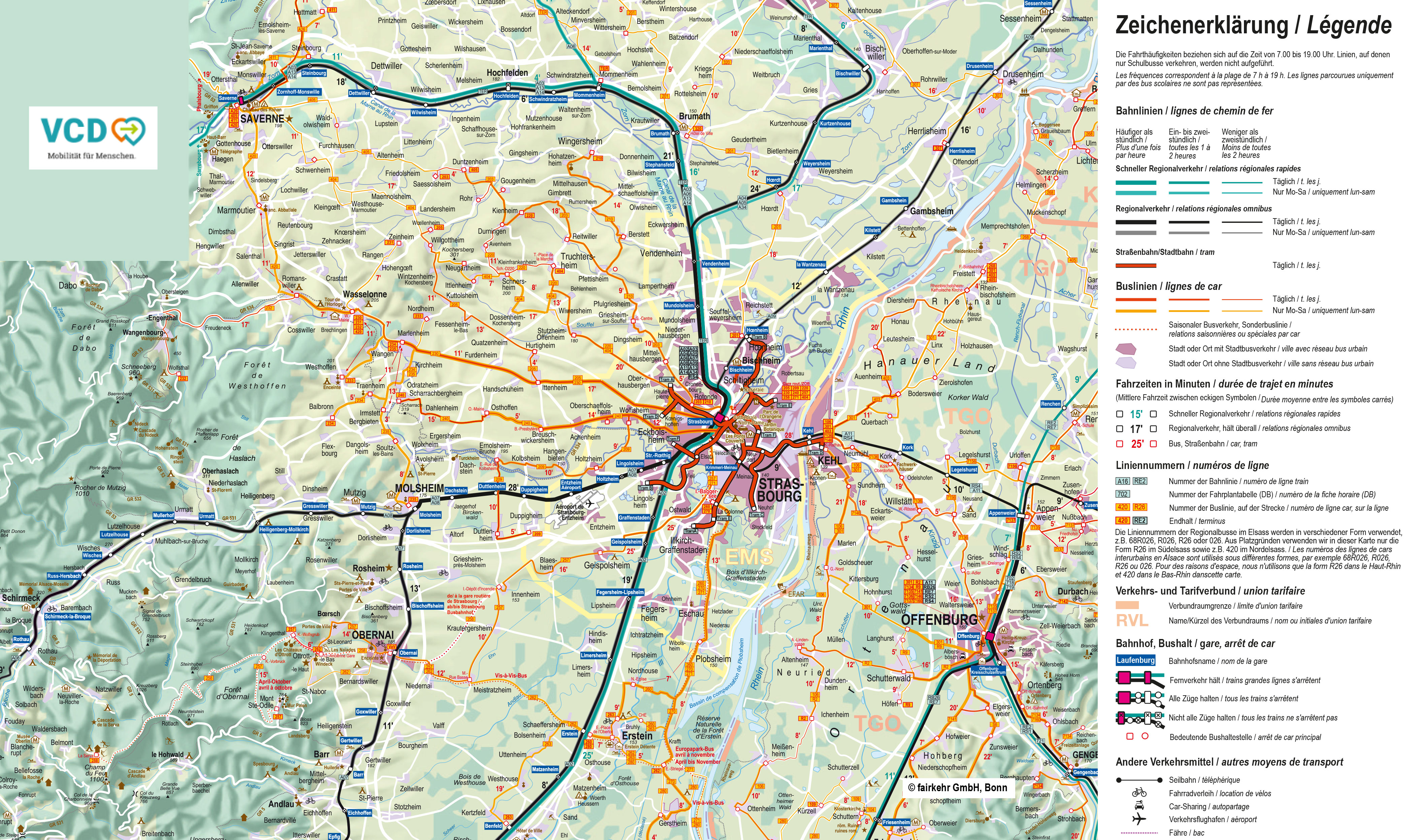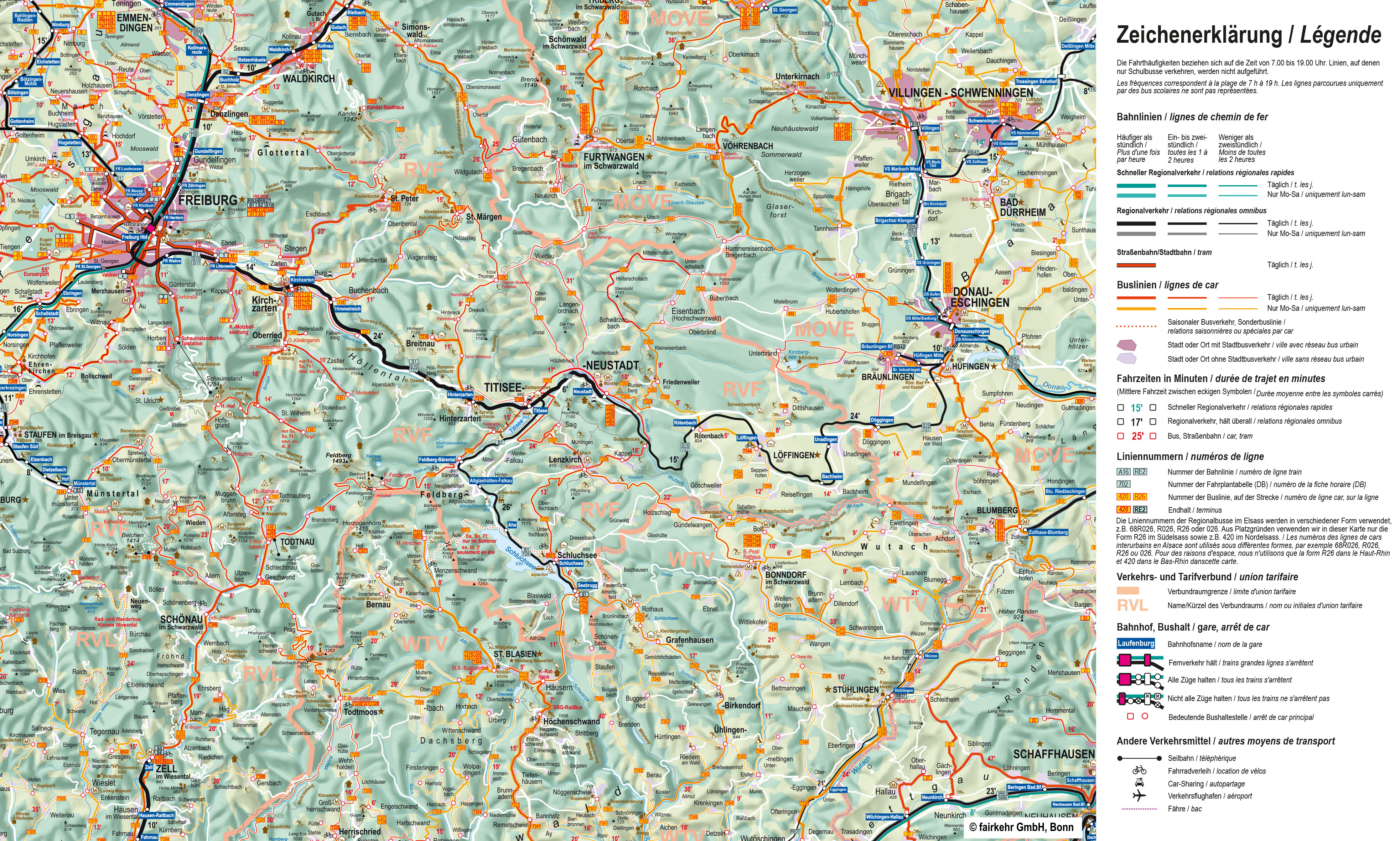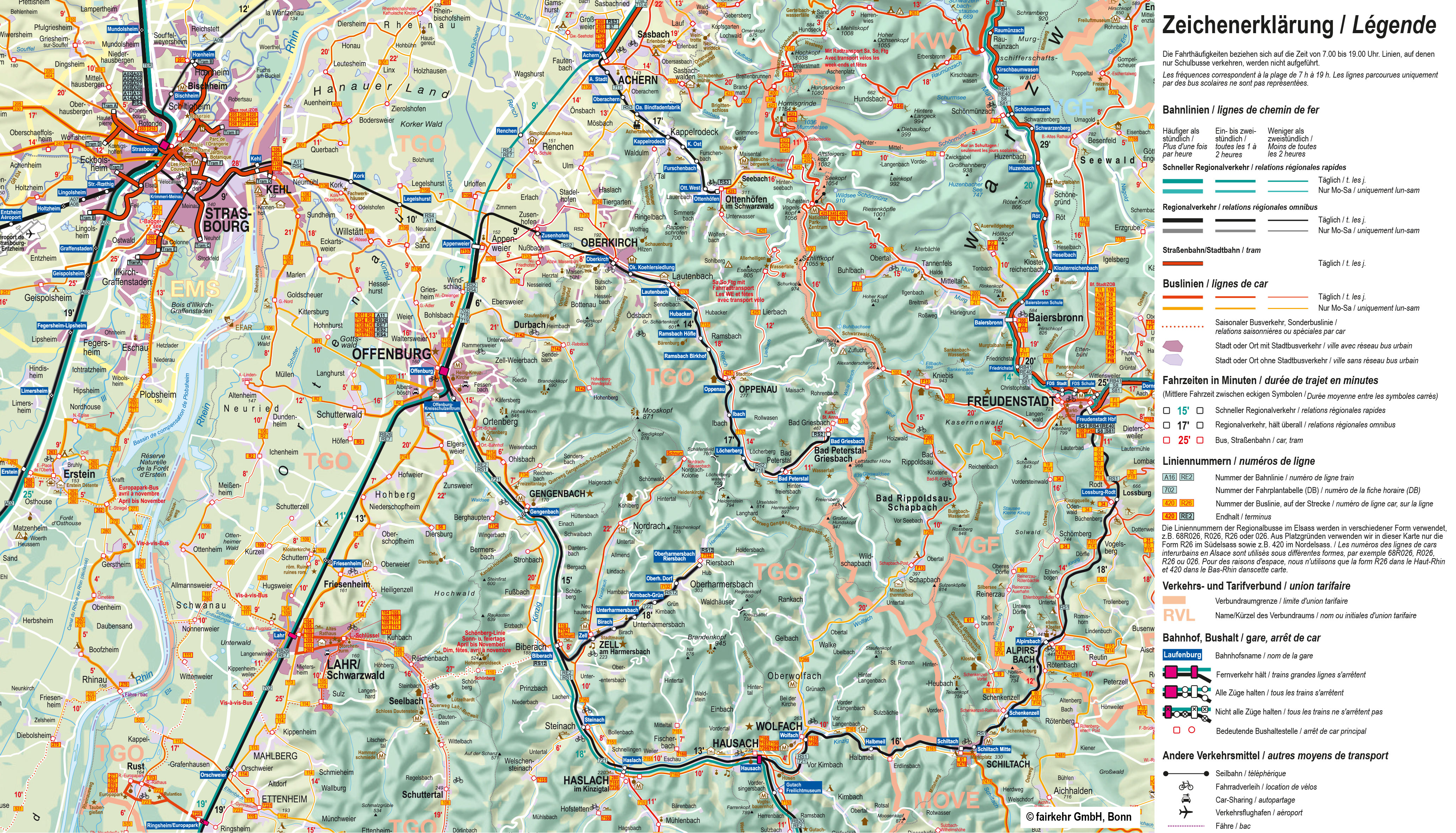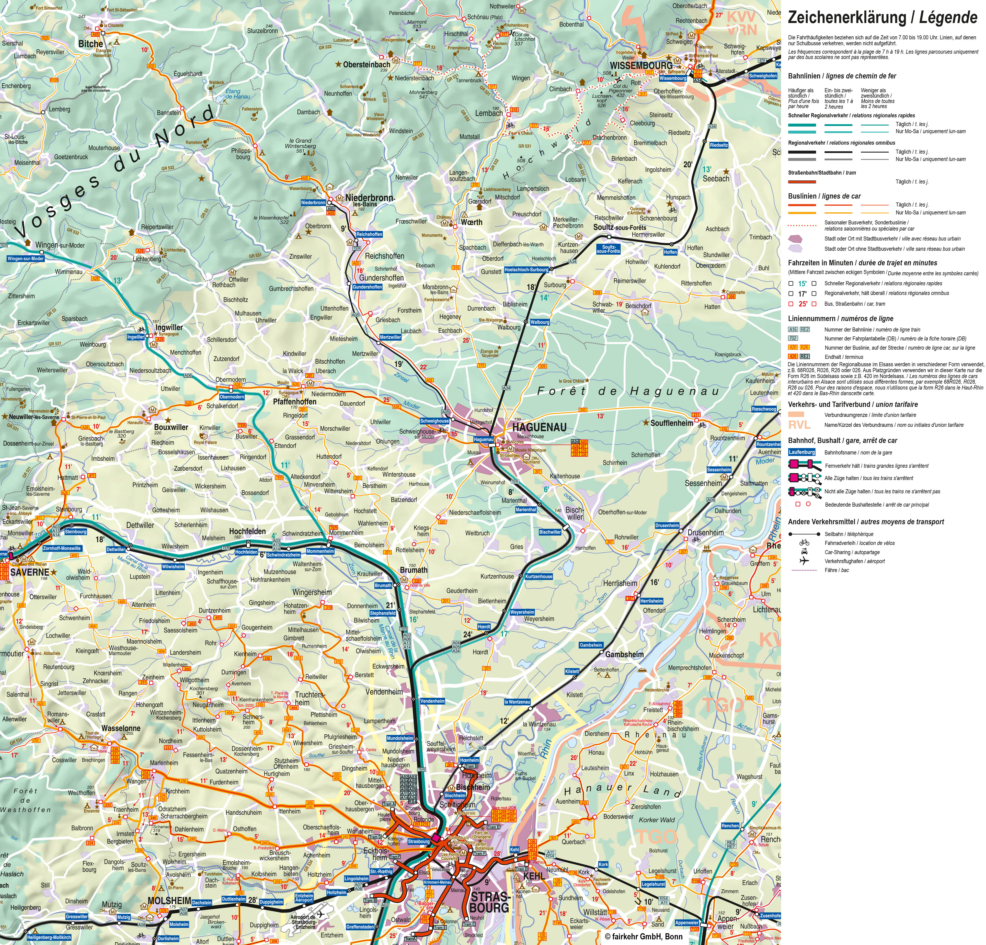 Veuillez noter que, pour des raisons d'espace, nous indiquons dans nos cartes les numéros de ligne sous la forme R26, etc. pour les bus du Haut-Rhin. Sur les bus eux-mêmes, la forme R026 est généralement utilisée, tandis que les horaires affichés aux arrêts indiquent la désignation complète 68R026 ou simplement 026. Il s'agit dans tous les cas de la même ligne.