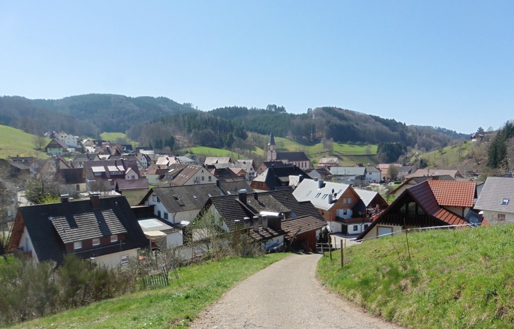 Schweighausen dans la haute vallée de la Schutter ; photo : Hannes LinckDe Lahr, le bus nous conduit jusqu'à Schweighausen, au pied du Hünersedel (744 m). C'est là que la Schutter prend sa source. De l'arrêt « Schweighausen Schule » nous remontons la route, pour prendre à gauche la rue Am Schießrain. Au fond nous grimpons la petite route suivant le losange jaune vers « Hallen ». Avant d'entrer dans la forêt nous pouvons nous reposer sur un banc et profiter du vue sur Schweighausen et les collines entourants.